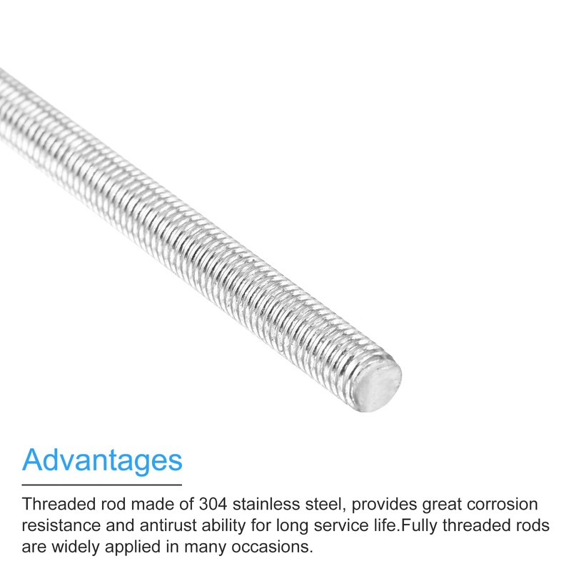 - Threaded rod made of 304 stainless steel, provides great corrosion resistance and antirust ability for long service life.Fully threaded rods are widely applied in many occasions.