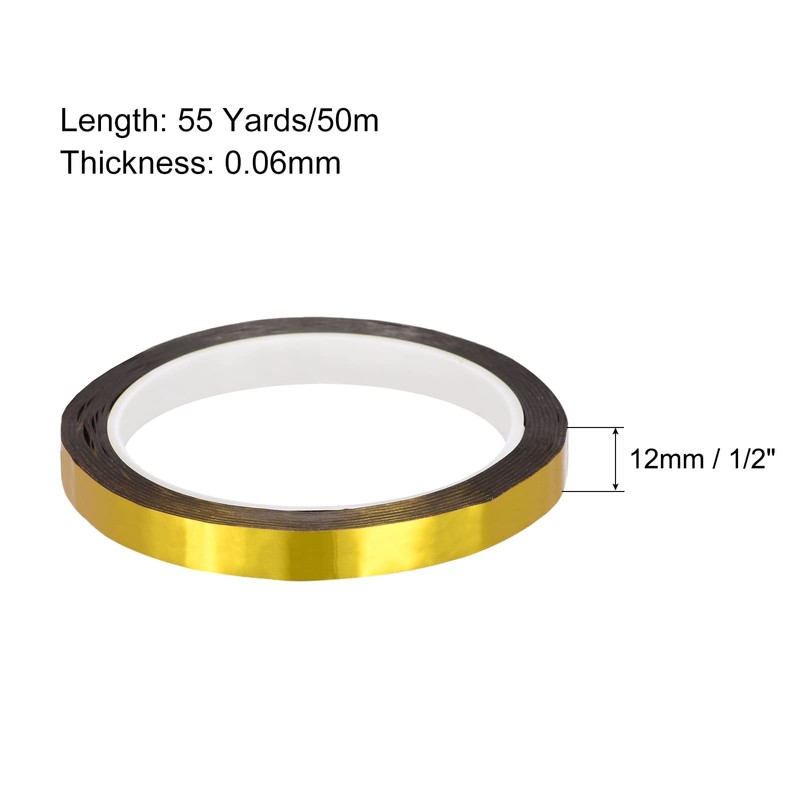 - Per Roll Total Length: 55 Yards/50m; Tape Width: 1/2 Inch/12mm; 0.06 millimeter; Color: Gold Tone; Material: Metalized Polyester and Aluminum Foil; In the package of: 2pcs x Gold Tone Metalized Tape.