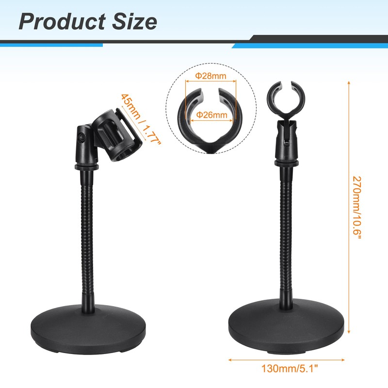 - Total size:130x270x185mm / 5.1x10.6x7.28 inch(WxLxH); Microphone clamp inner diameter: 26-28mm; Microphone clip length: 45mm / 1.77 inch; Microphone clip shape: Hollow square clip; Color: Black