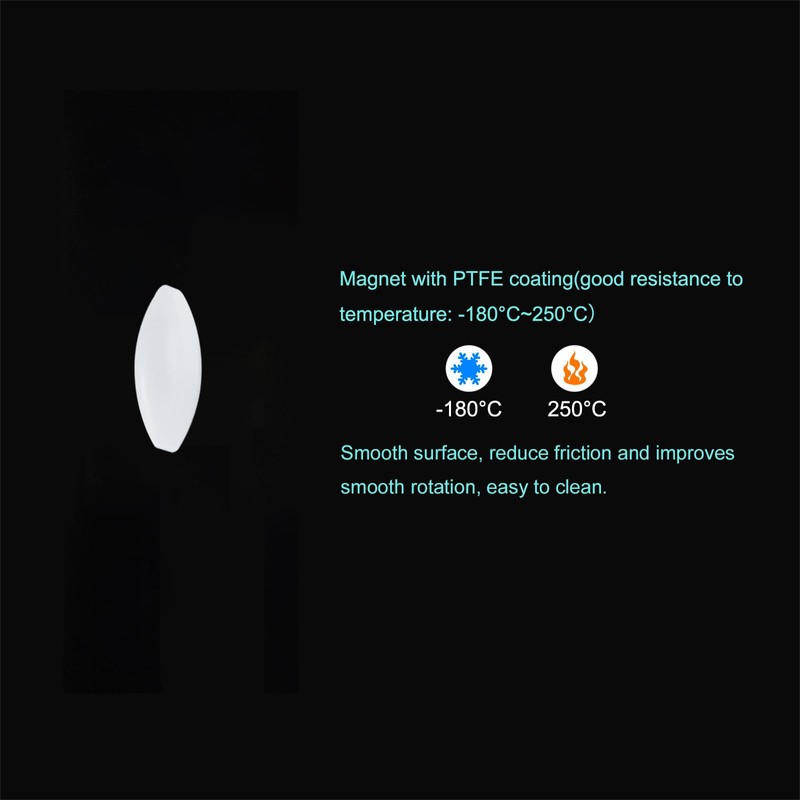 - The magnetic stir bar is made from magnet with PTFE coating, the coating is corrosion resistant and has good resistance to high temperatures (temperature tolerance range:-180 ℃~250 ℃)