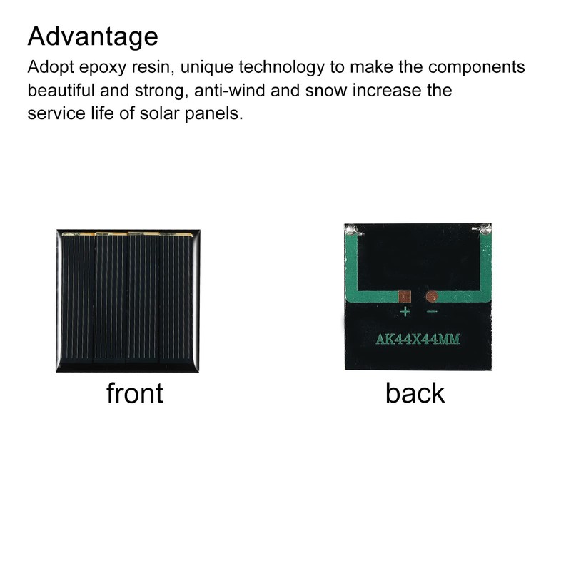 The mini solar panel, in size of: Rated Voltage: 2V; Current: 110mA; Power: 0.22W; Size: 44mm x 44mm/1.73 inch x 1.73 inch
