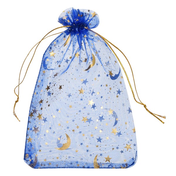 MECCANIXITY Organza Bag 5" x 7", Sheer Moon Star Mesh Bags Drawstring Gift Bags Bulk Party Favor Bag Jewelry Pouches for Wedding Candy Valentines (Bright Blue-Gold, Pack of 100)