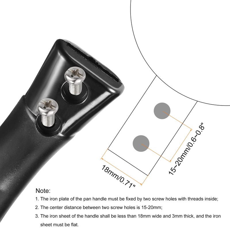 - Note: 1. The iron plate of the pan handle must be fixed by two screw holes with threads inside; 2. The center distance between two screw holes is 15-20mm; 3. The iron sheet of the handle shall be less than 18mm wide and 3mm thick, and the iron sheet must be flat