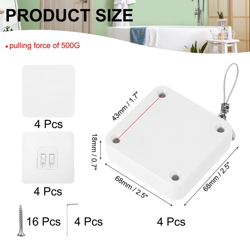 The Automatic Door Closer coupling, OUR provides here, is in size: 63x63x18mm(2.5x2.5x0.7inch) (LxWxH); Center Distance: 43mm(1.7inch); Steel Rope Length: 1.2m (47inch); Color: White; Material: ABS, Steel