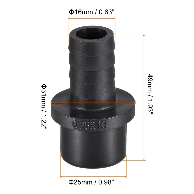 - Color: Black; Fitting Shape: Straight; Barb Outer Diameter: 16mm / 0.63 inch; Spigot Outer Diameter: 25mm / 0.98 inch; Overall Dimension: 49x31mm / 1.93x1.22 inch (L*Max. OD); Package Content: 2 x Barbed Socket Joints