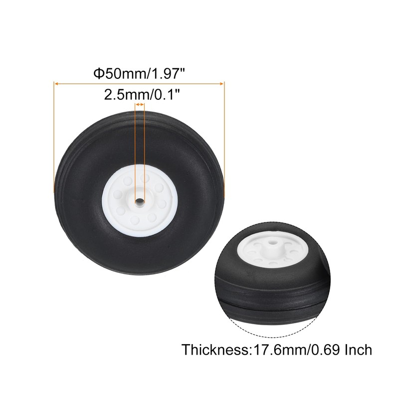 • RC Model Plane Aircraft Wheel,is in size of:Outside Diameter:50mm/1.97 Inch;Thickness:17.6mm/0.69 Inch;Axle Hole Diameter:2.5mm/0.1 Inch;Color:Black,White;Material:PU sponge tires,plastic hub;In the package of:4 x RC Airplane Aircraft Sponge Wheels;
