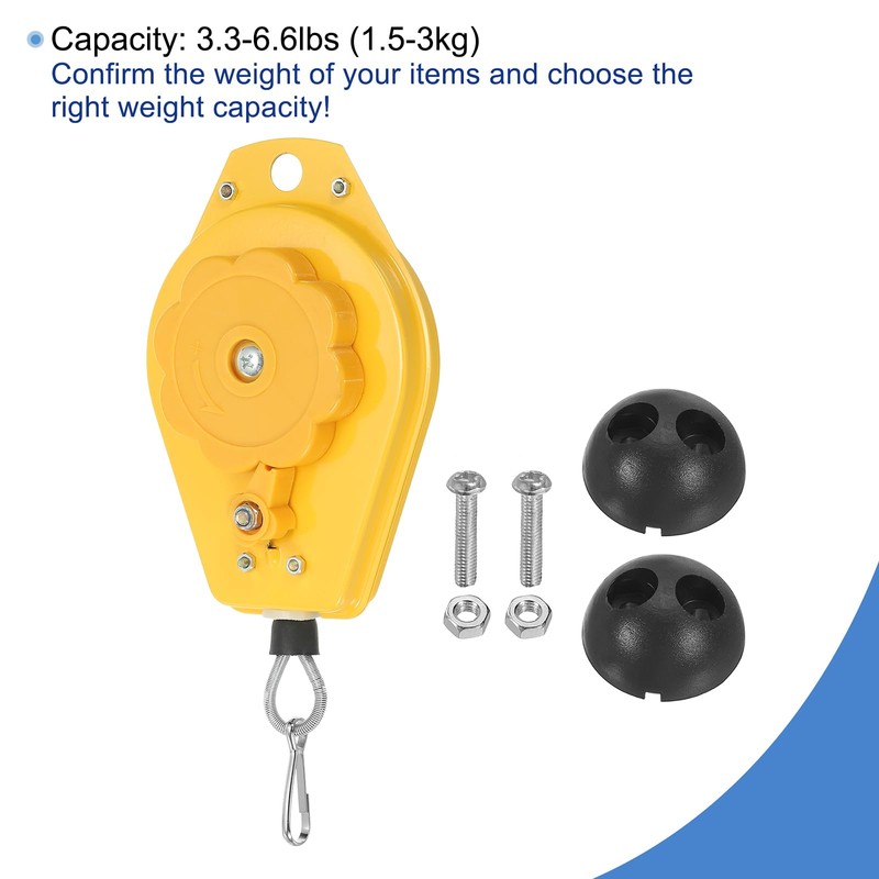 • Retractable spring balancer is in specification of Capacity: 3.3-6.6lbs (1.5-3kg); Stretch Length: 1.4m / 4.6 ft; Size: 145mm x 100mm x 35mm / 5.71 x 3.94 x 1.38 inch