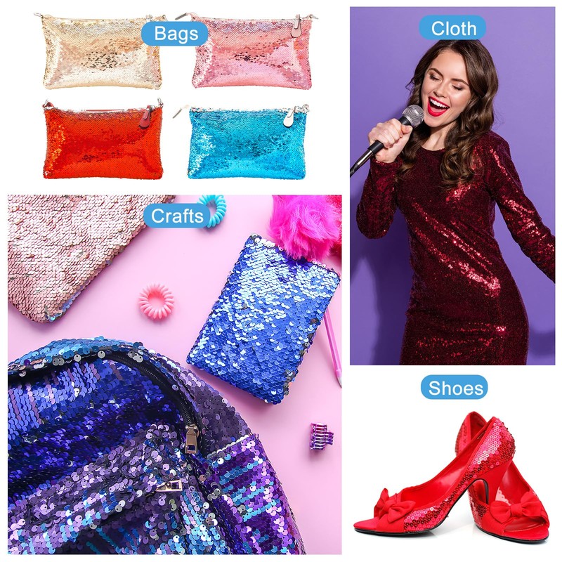- The sequin fabrics can be easily cut by hand or machine into different shapes and sizes as required, great suitable for dance wear, wallets, handmade hats, as well as tablecloth, backdrop, table runner, etc.