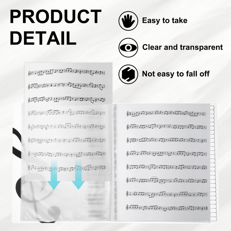 - 1.The Sheet music organizer can be unfolded 180 degrees and laid flat on the piano music stand, providing a comfortable viewing angle and very convenient to use. 2.The inner pages of the Sheet music folder are transparent and clear, so you can easily see the music score, and it is easy to take. 3.Made of PP material, very comfortable frosted touch, non-slip, waterproof and tear-resistant. Delicate workmanship, very durable.