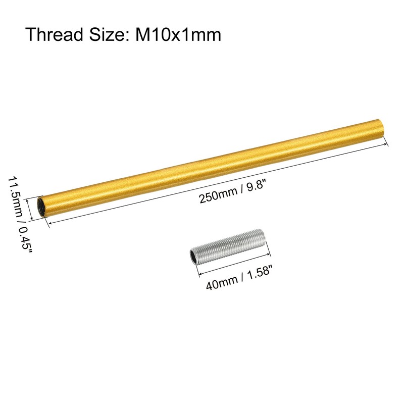 - Material: Iron Electroplated; Color: Gold Tone; Thread Size: M10; Thread Pitch: 1mm; Long Coupling Nut Size: 11.5x250mm / 0.45"x9.84" (Diameter*Length); Threaded Pipe Length: 40mm / 1.58"