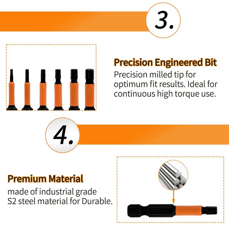 - Durable - Industrial grade S2 alloy steel bits with hardened to provide improved durability and reduced breakage, black oxide finish for corrosion resistance.