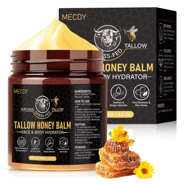 MECDY Organic Beef Tallow for Skin, Tallow and Honey Balm for Face & Body, Natural Grass Fed Tallow Moisturizer with Raw Honey & Beeswax for Soft, Smooth Skin, Light Scent, 4.2 Oz