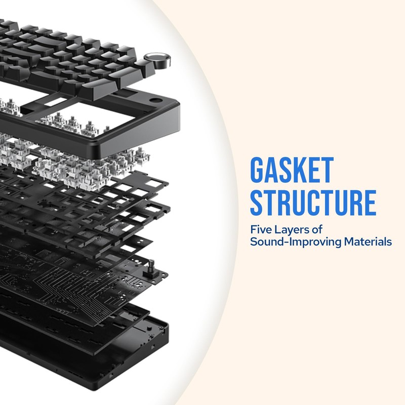 • 【Five Layers of Sound-Improving Materials】 Equipped with five layers of sound-dampening materials, the AULA F99 PRO enhances its typing acoustics. The combination of sandwich foam, IXPE switch pad, PET sound-improving film, bottom foam, and silicone case pad helps eliminate echoes and provides a pure typing sound with a stable and comfortable typing feel.