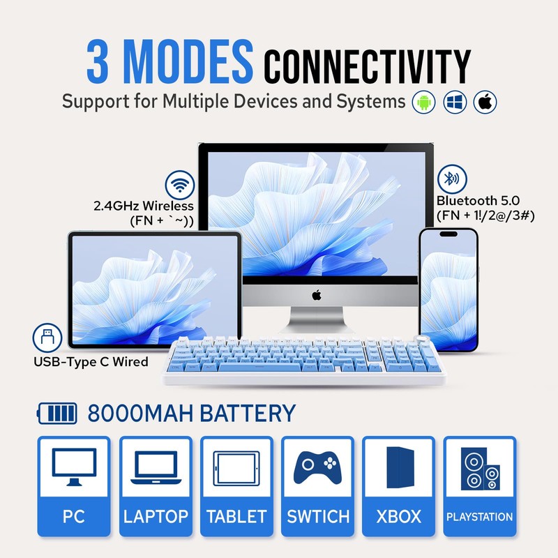 • 【Tri-Mode Connectivity and 8000mAh Battery】 Supporting Bluetooth 5.0, 2.4GHz wireless, and Type-C USB wired connections, the AULA F99 PRO offers versatile and seamless connectivity up to 10 meters. Its robust 8000mAh battery ensures efficient multitasking and sustained performance across all three connection modes, making it ideal for both work and play.