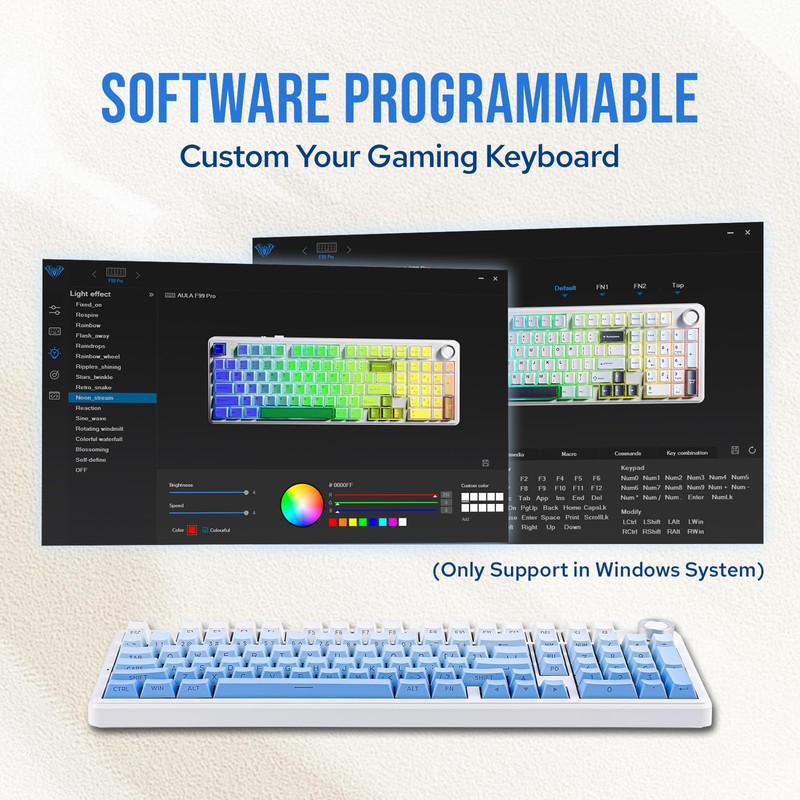 • 【Customizable with AULA Driver】 Create your personalized keyboard experience using the AULA DRIVER to remap keys, adjust RGB effects, create macros, and access more functions. This customization allows you to tailor the F99 PRO to meet your specific needs and preferences.