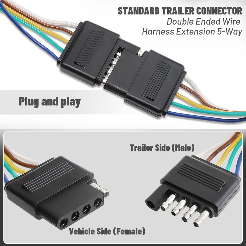 - Extensión de 5 vías: estos enchufes de cableado de remolque de 5 pines vienen listos para conectar a tu vehículo existente y cableado de remolque, son un gran reemplazo de 5 conectores de cableado de remolque planos para tu vehículo y remolque. Arnés de extensión de alambre de doble extremo de 5 vías comúnmente utilizado en cables de corriente extendidos en remolques de barco, especialmente para remolques con frenos de sobretensión.