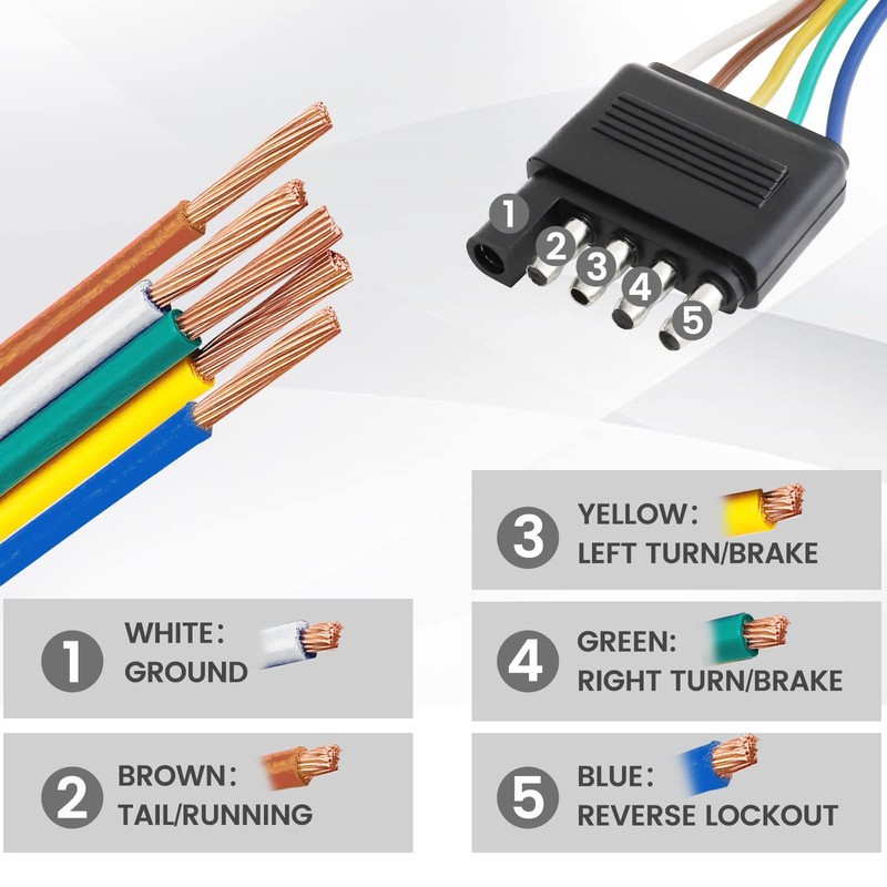 - Alto rendimiento: este cableado de remolque de 5 planos está hecho de una construcción duradera moldeada de goma y con 48 pulgadas de alambre de bucle de alta resistencia codificado por colores estándar, calibre 18 para empalmar fácilmente en el sistema de cableado de tu vehículo.
