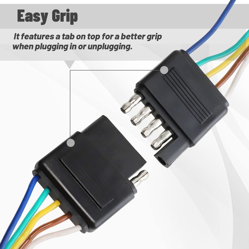 - Fácil agarre: el cableado de cable plano MECMO 5 cuenta con pestañas en los lados para un mejor agarre que te da una conexión fiable cada vez que enchufas tu remolque. Este conector plano de 5 vías está diseñado para soportar tu conexión de luces traseras, luces de freno, intermitentes, luces de marcha atrás y una conexión a tierra.
