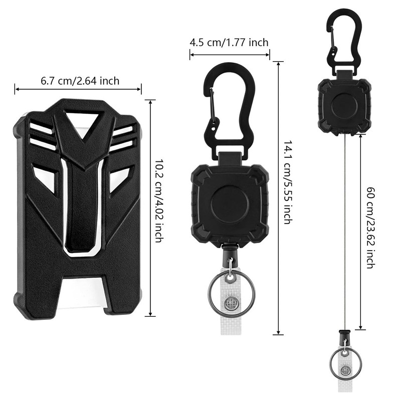 Introducing our premium retractable id badge holder with a sleek black lanyard, designed to enhance both security and convenience for professionals. This id card holders with clip is an essential accessory for anyone needing quick access to ID cards, business cards, or key holders. Crafted with meticulous attention to detail, our retractable key holder offers durability and reliability, making it ideal for daily use. The external dimensions of the id holder for lanyard measure 4.02" x 2.64" x 0.35", while the internal dimensions are 3.35" x 2.13" x 0.16", providing ample space for various cards, including ski pass retractable holder and retractable key chain. The heavy duty retractable keychain measures 4.33" x 1.34" x 0.63", ensuring robust performance and long-lasting use. Made from high-quality zinc alloy and ABS plastic, this lanyards for keys can securely hold multiple badges and up to 7 keys, making it an excellent choice for those who require a versatile, multi-functional accessory. Our lanyard with card holder retractable reel features a strong steel wire cord, designed to withstand the rigors of everyday use. This ensures that your retractable keychain heavy duty remains securely attached, whether you're using it as a ski pass holder, retractable card holder or work ID badge holder. The lanyard holder is perfect for professionals who require quick and easy access to their ID cards or keys, while the retractable lanyard with card holder feature provides convenience and security. This extendable keyring with clip is not only functional but also stylish, with a black color that complements any professional attire. The retractable badge reel allows for easy extension and retraction, making it simple to present your ID card or access card when needed. Additionally, the keychain lanyard is equipped with a clip-on feature, allowing you to attach it securely to your belt, pocket, or bag. Whether you need a cord holder for a lanyard, a key chain retractable , or a lanyard with a retractable reel, our product meets your needs with precision. The id badge reel for the lanyard is designed to protect your cards from damage and wear, ensuring they remain in pristine condition