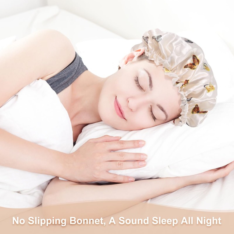- Seidenhaube zum Schlafen: Die satinierte Haarkappe ist die ganze Nacht ehrlich am Kopf stabilisiert, um zu verhindern, dass Ihr Haar durch den Schlaf gezogen wird. Schlafkappe kann Sauberkeit und Feuchtigkeit besser schützen und die Bildung von Spaltenden Enden reduzieren.