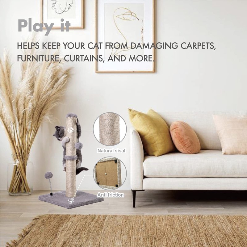 MECOOL Basics Cat Scratching Post Two sizes are designed for kittens and adult cats Featuring a naturally fibrous construction, your cat will take great joy in clawing the rope pillars and batting around the included Interactive toy With Hanging ball attachment. Helps keep your cat from damaging carpets, furniture, curtains, and more. You can put the cat tree next to the bed, window or anywhere in the house.Neutral color tones fit in with your home’s existing decor. Easy to install Just screw all the parts together and the cat scratching post is ready to use (including screws)