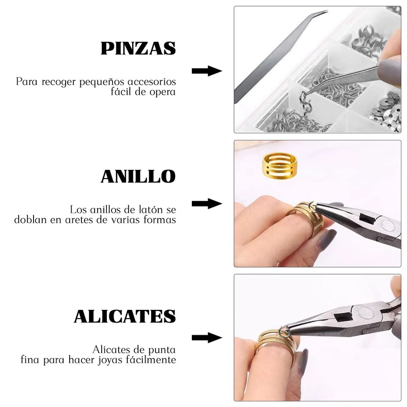 Este conjunto de joyería DIY material bisuteria incluye una variedad de elementos que le permitirán crear joyas personalizadas a su gusto. Incluye kit bisuteria de diferentes tamaños y forma, así como herramientas como alicates de punta redonda, cortantes, pinzas entre otros.