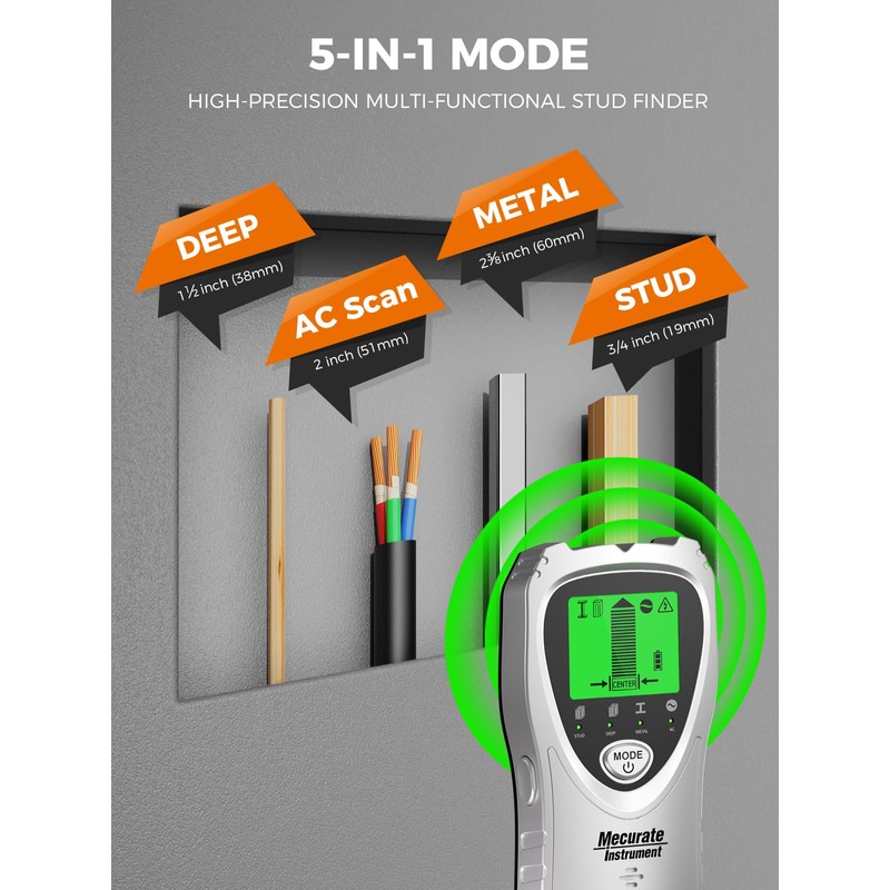 - 【5-in-1 Multi-Mode Scanner for Versatile Detection】Featuring Standard (3/4"), Deep (1-1/2"), Metal (2-3/8"), and AC (2") modes with audio alerts, the Mecurate stud finder ensures accurate detection of studs, metal, and wires for hassle-free home improvement.