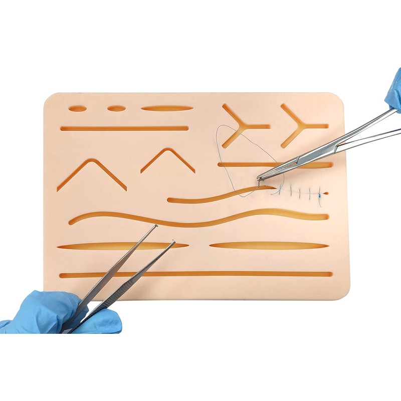 This sewing pad is designed with 3 layers to resemble human skin, subcutaneous and muscles. The pads are designed with different sizes of pre-cut scratches and are intended for first class sewing techniques. Users can develop their experience by practicing sewing with pads.