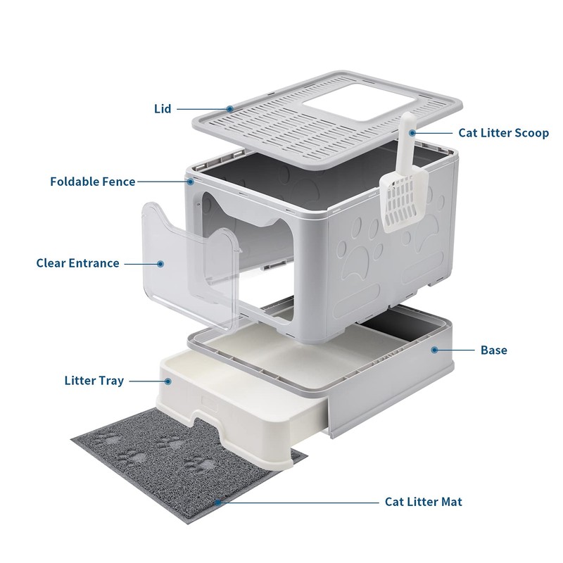 - [Enclosed Layout] - One-way design, front in and top out, the self-closing front entryway leaves odor and dirt inside. The top sand pedal prevents the cat's litter from being sprayed everywhere. The enclosed structure secures pet cat's privacy.