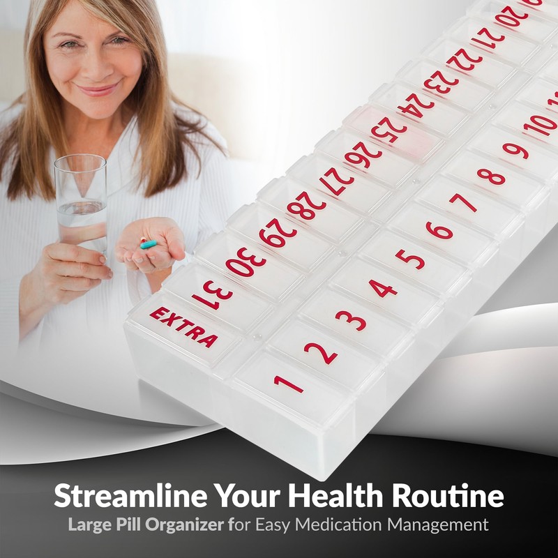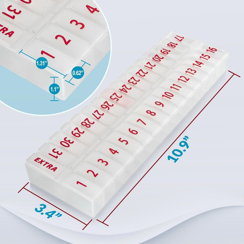 - EFFORTLESSLY ORGANIZE YOUR PILLS Say goodbye to daily medication confusion with our innovative monthly pill organizer. Made from clear, unbreakable BPA-free plastic. This monthly pill box with 32 compartments is from 1 to 31 with an additional 32. Compartment labeled, your ultimate recipe for precision.
