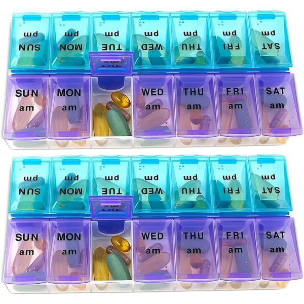 • EXCEPTIONAL DESIGN: The pill organizer has a contoured design for easy pill removal. It includes fourteen large compartments and lets you store medicines in bulk. The box comes in bright and attractive colors.