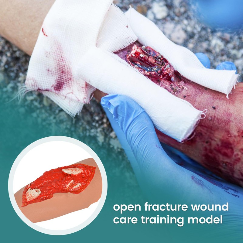 - Simulación realista de heridas: este entrenador de heridas de fractura abierta replica una lesión grave con hueso expuesto para entrenamiento de cuidado de heridas.
