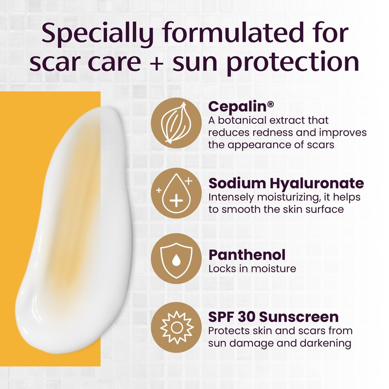 - EFFECTIVE SCAR TREATMENT: With Cepalin botanical extract, for old and new scars caused by: acne, burns, injury, surgery; SPF 30 helps protect scars from sun damage and darkening
