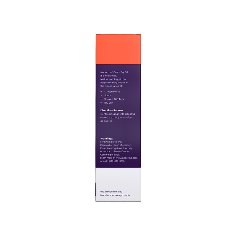 Soft, hydrated, healthier looking skin can be yours with Mederma Quick Dry Oil. The unique blend of natural botanical extracts penetrates into the skin to help visibly reduce the appearance of stretch marks and scars. Its the only oil that combines Cepalin with natural botanicals in a fast-absorbing, paraben, fragrance, dye and mineral oil free formulation. For nourishing support, it contains a complex blend of natural oils and botanicals: Sweet Almond oil helps to nourish and moisturize. Rose Hip oil, rich in Vitamin C, is a natural skin brightener which helps improve skin tone. Sunflower oil helps to maintain skin's natural moisture level. Coconut oil helps to seal in moisture while creating luxuriously soft, hydrated skin. Chamomile and Ginger extracts help soothe and reduce blotchiness .Each application of this fast-absorbing oil helps to improve the appearance of scars, stretch marks, uneven skin tone and dry skin. Trust Mederma, the #1 recommended brand of scar treatments among Doctors, Pharmacists, Pediatricians, Dermatologists and Plastic Surgeons (Of U.S. physicians and pharmacists surveyed by an independent market research firm).
