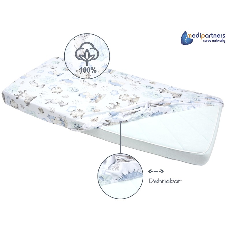 Medi Partners Fitted Sheet 60 x 120 cm, 3-Pack Baby Bed Sheet, 100% Cotton, Fitted Children's Sheet Bed Linen, Baby Mattress, Sleeping Bag, Baby Bed (Stag and Hedgehog White / Grey)
