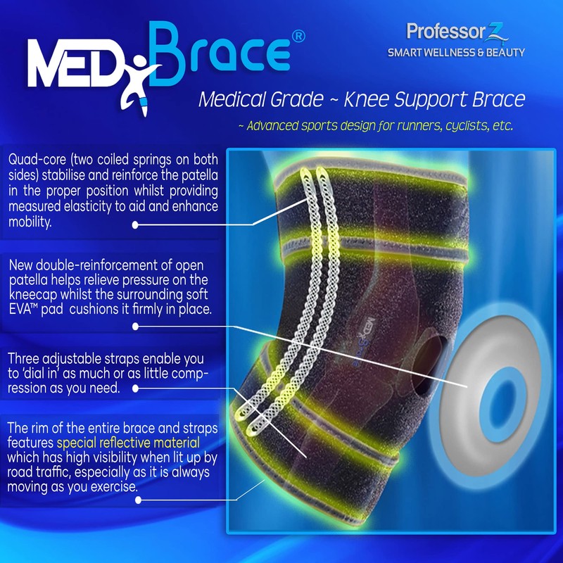 - 🏆 HI-VIS REFLECTIVE DESIGN FOR RUNNERS: Unlike any other knee support brace, the MEDiBrace has hi-vis material bordering the entire rim of this knee brace, the repetitive movement of your leg effectively alerting motorists of your presence at night. Designed in London, England