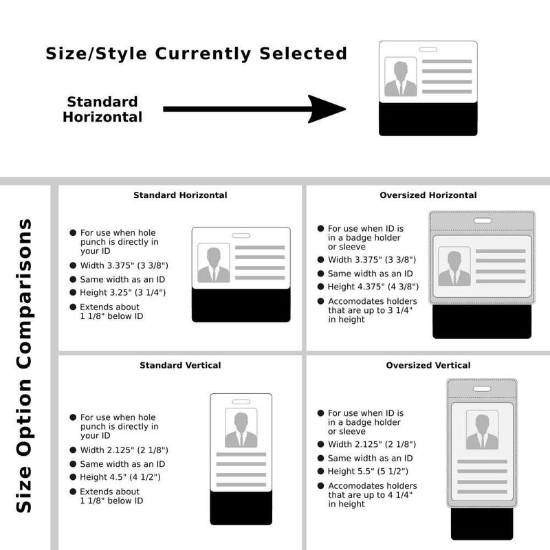 - Available in two sizes – Standard size for when your ID has a hole punched in it and Oversized if you use a badge holder/sleeve.