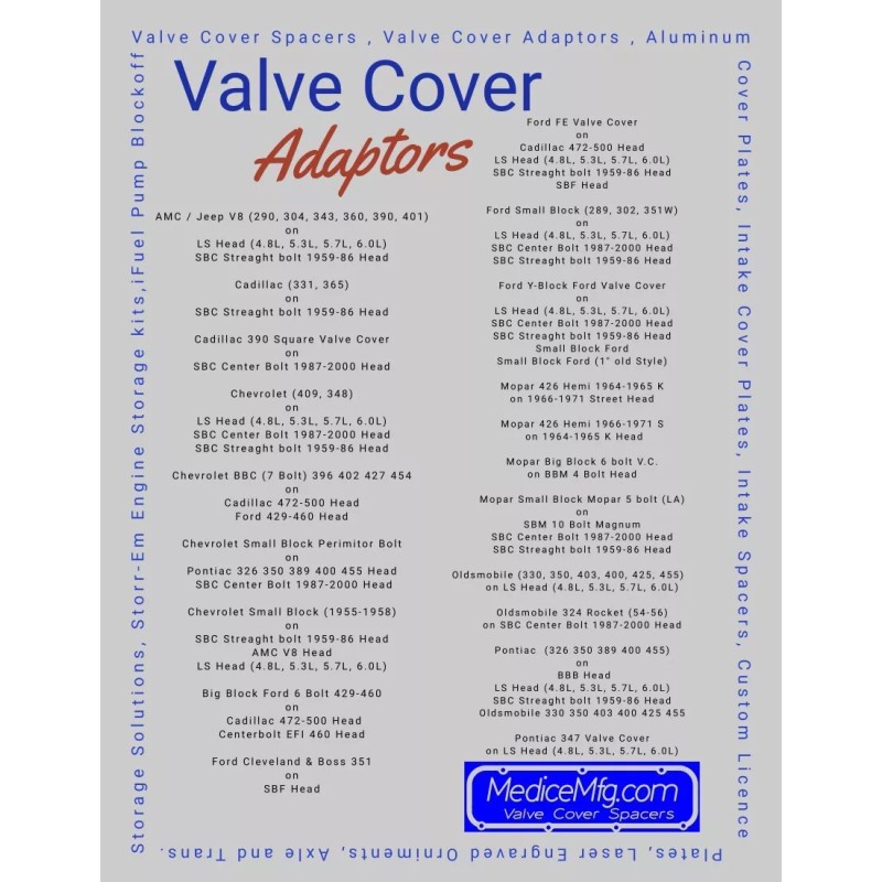 - With Medice Manufacturing Valve Cover Spacers you no longer have to use tall valve covers to clear enhanced-performance valve train components.