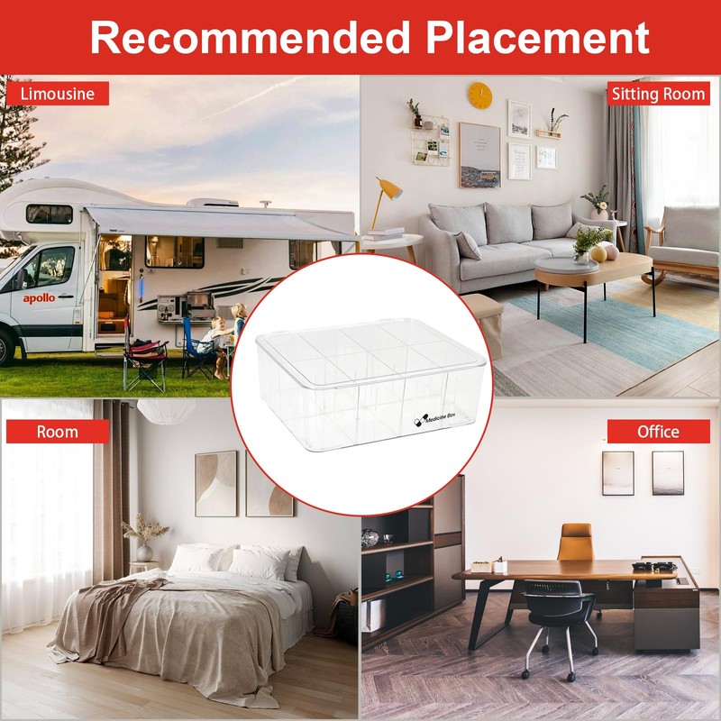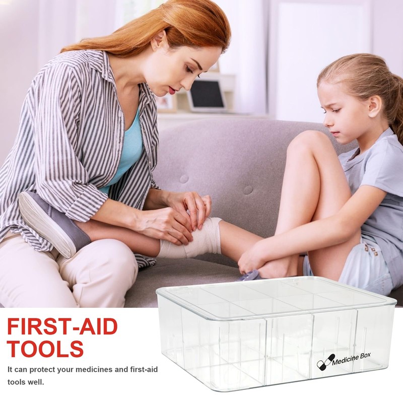 - SEE-THROUGH,STRESS-FREE: No more rummaging around! Our pill box design allows for quick identification of contents, saving time and eliminating the guesswork in locating your essential items,Find smaller items like a band-aid, adhesive tapes, medicines, pills, and cotton balls at a glance.