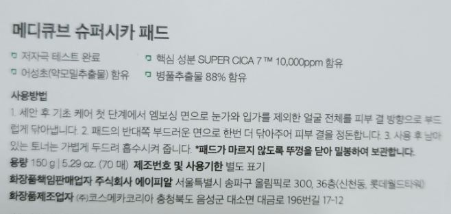 수분 진정 패드 70매 1통 슈퍼 시카 패드 메디큐브 고농축 병풀 쿨링 팩 비건