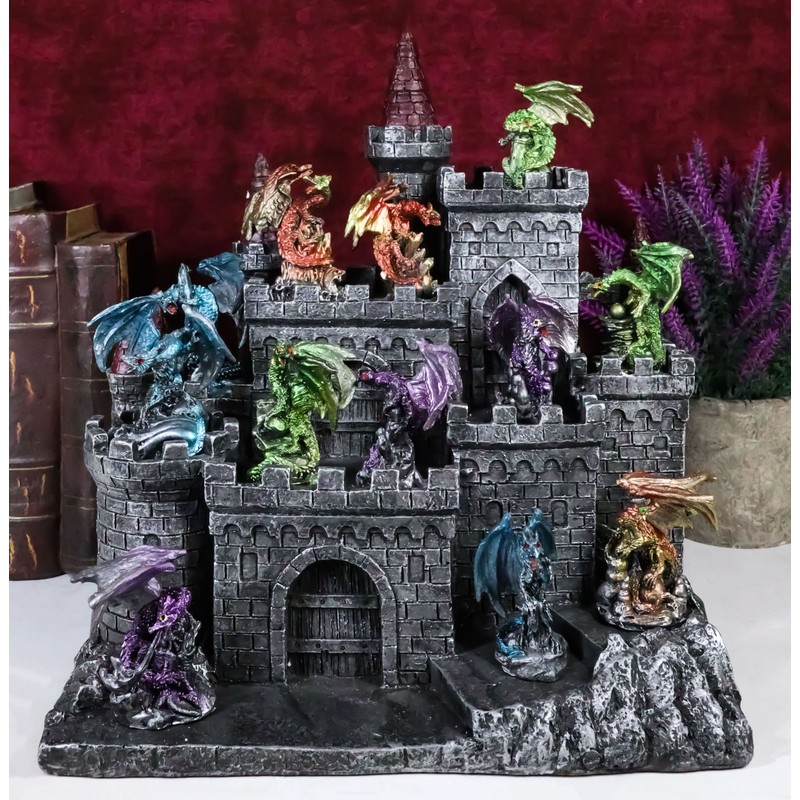 • These multicolored miniature dragon figurines and castle display stand are made of polyresin, hand painted and polished individually.