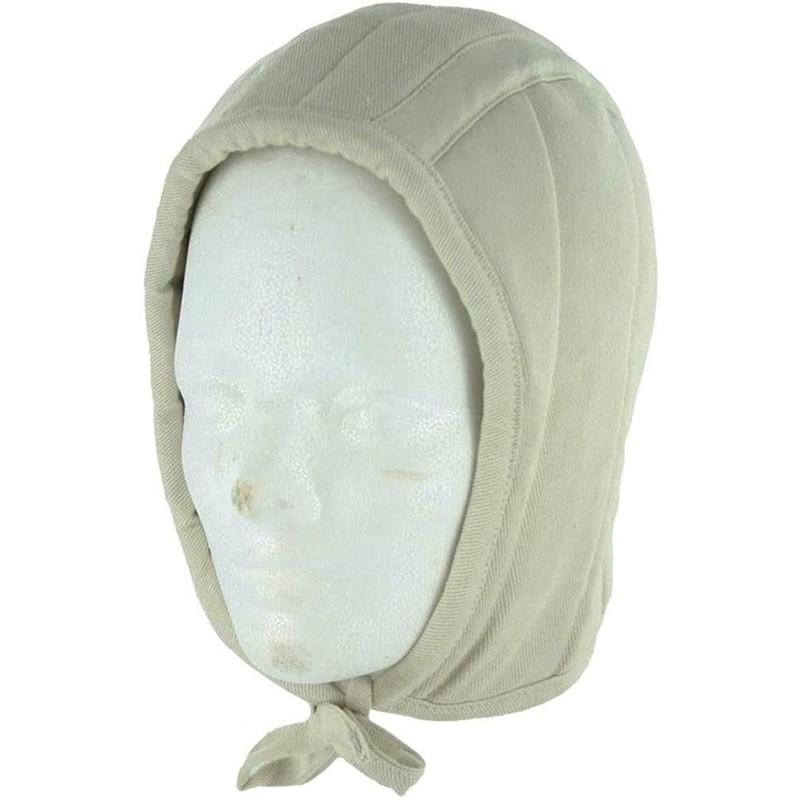 100% Layered cotton is used to absorb impacts and shock from a blow. Thick stitching provides durable functionality. In medieval times soft padding was worn under metal armor. It helps to absorb the impact and shock from a blow. Original Coifs were stuffed with rags and straw, but this modern coif uses layers of compressed cotton. The color is accurately described as "ecru", and resembles a white or beige.