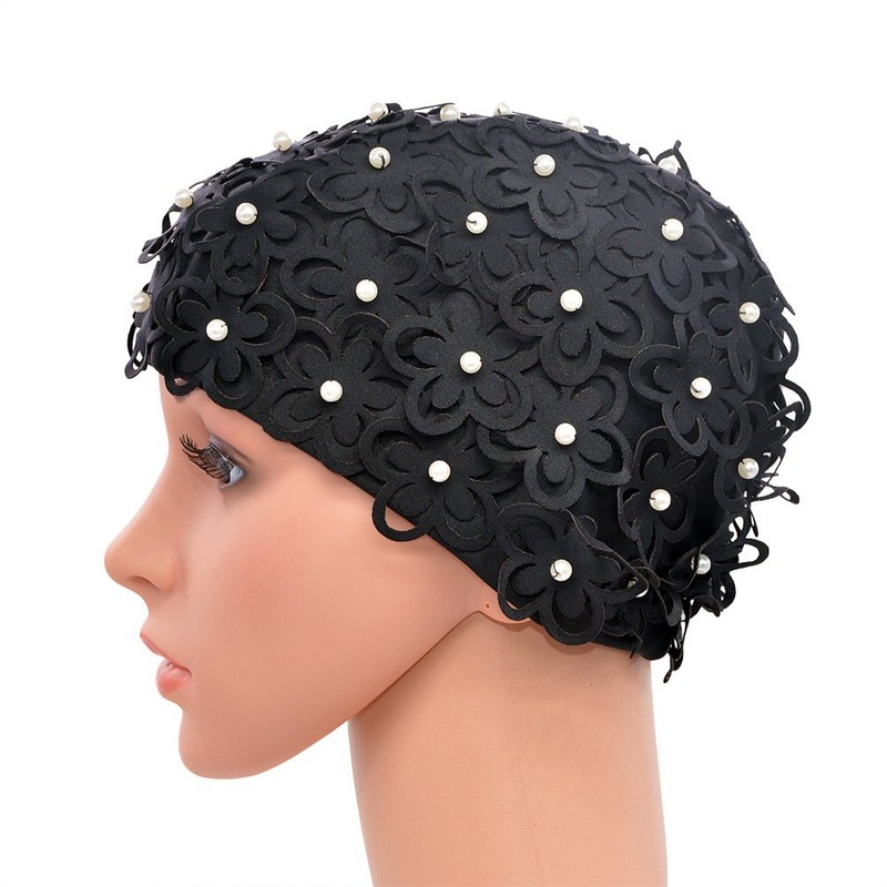 Medifier Hollow Flowers Pearls Sewn by Hand Women's Ladies Swimming Hat Swim Cap Bathing Cap (Black)