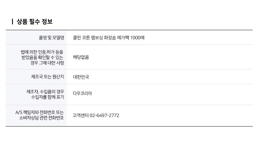 대용량 클린 코튼 엠보싱 화장솜 메가팩 1000매