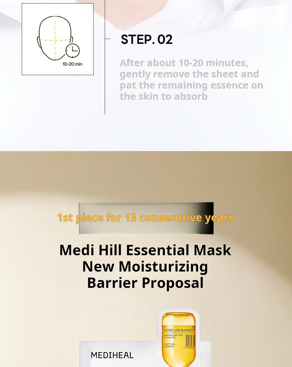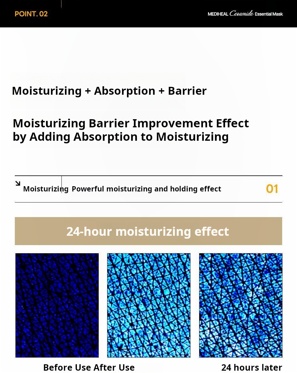 Shows even more powerful moisturizing barrier-enhancing effects by adding absorption to moisturizing. Deeply and quickly fills and locks in moisture without dryness to show moist and elastic skin barrier. Provides long-lasting deep moisturizing that does not dry out for a long time and includes barrier-enhancing effects in one mask sheet for dry and rough skin.