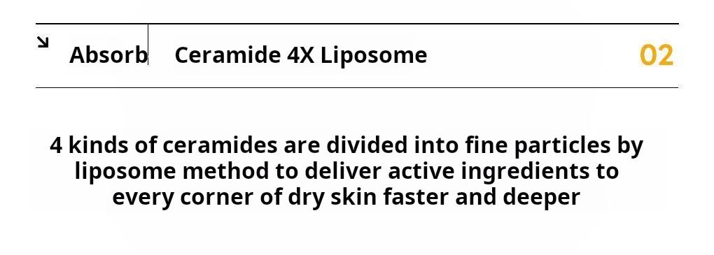 Removes impurities with a strict refining process to show even deeper moisturizing effects with 4 types of ceramide. Delivers the effective ingredients of dry skin to deeper parts of the skin more quickly and deeply by breaking down the 4 types of ceramide into fine particles with liposome technology. The 4 types of ceramide and panthenol & ectoine penetrate deeply into the skin to show non-greasy smooth moisturizing. The bamboo-derived sheet that is full of moisturizing essence adheres comfortably to the skin curves without lifting.
