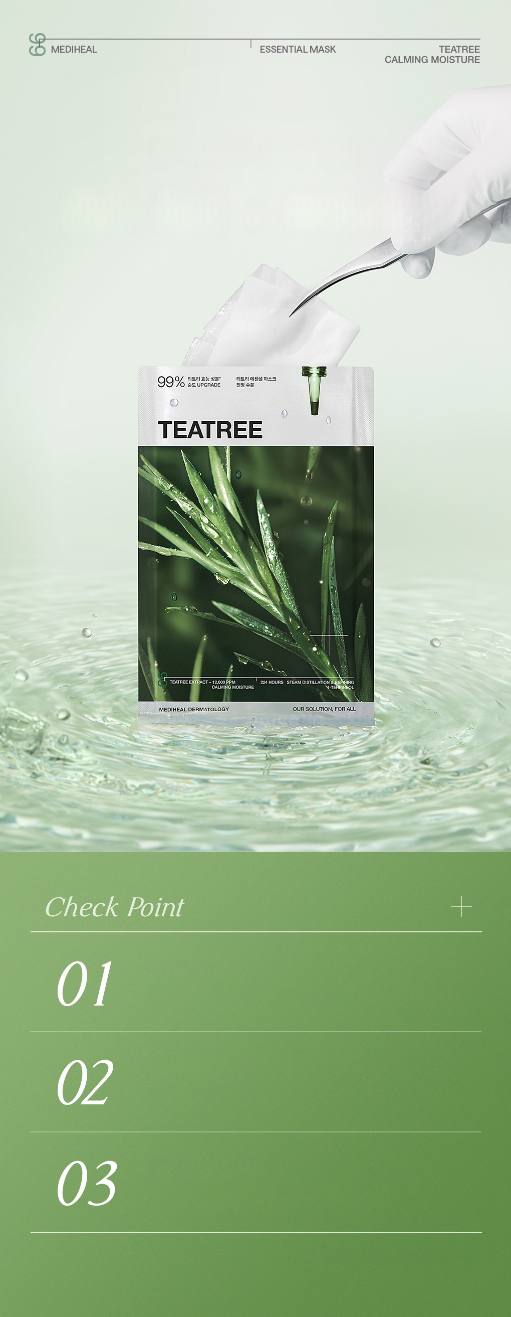 Contains glyceryl glucoside, rose of Jericho, and trehalose for deep moisturizing effect. Contains 99% tea tree formula of MEDIHEAL to provide skin soothing and moisturizing.