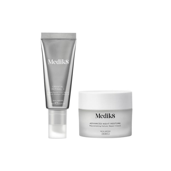 The Medik8 Crystal Retinal 3 and Advanced Night Restore Bundle is a powerful anti-aging skincare set that includes a night serum and cream to resurface, renew, and deeply hydrate the skin while reducing the appearance of fine lines and wrinkles.