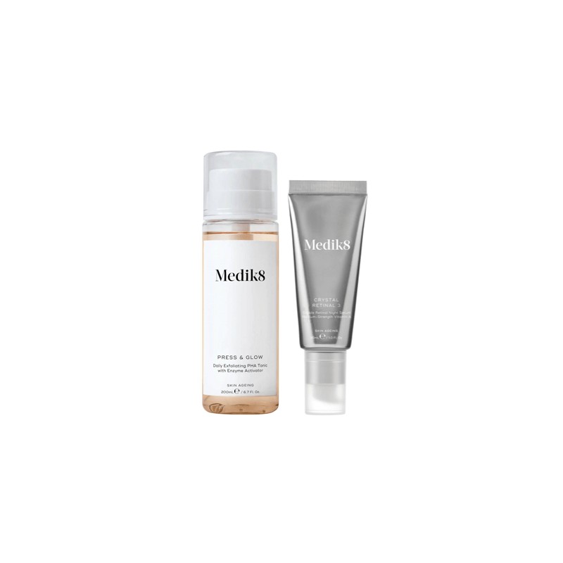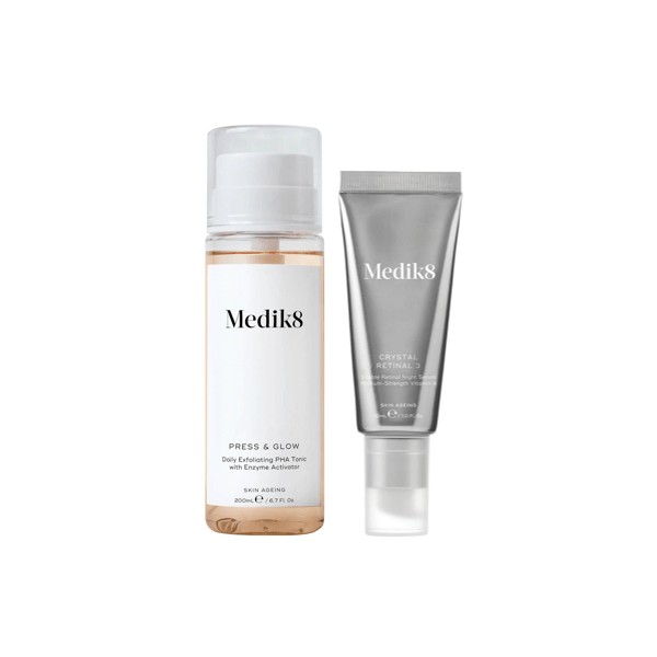 The Medik8 Press & Glow and Crystal Retinal 3 Bundle is a powerful skincare duo that includes a daily exfoliating PHA tonic and a night serum with next-generation anti-aging results.