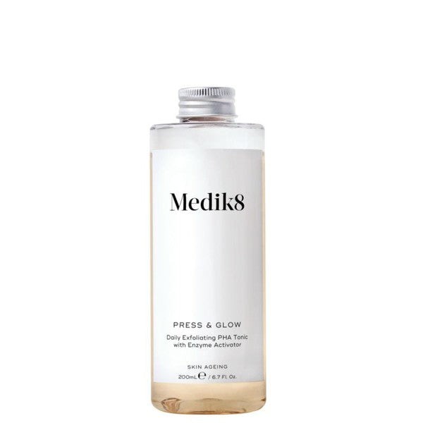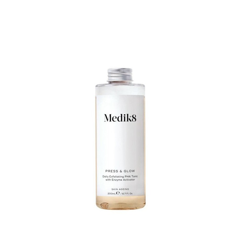 Medik8 Press & Glow is an exfoliating acid toner formulated with poly hydroxy acid (PHA) that works to resurface the skin without causing irritation, comes in a handy pump action refill bottle.